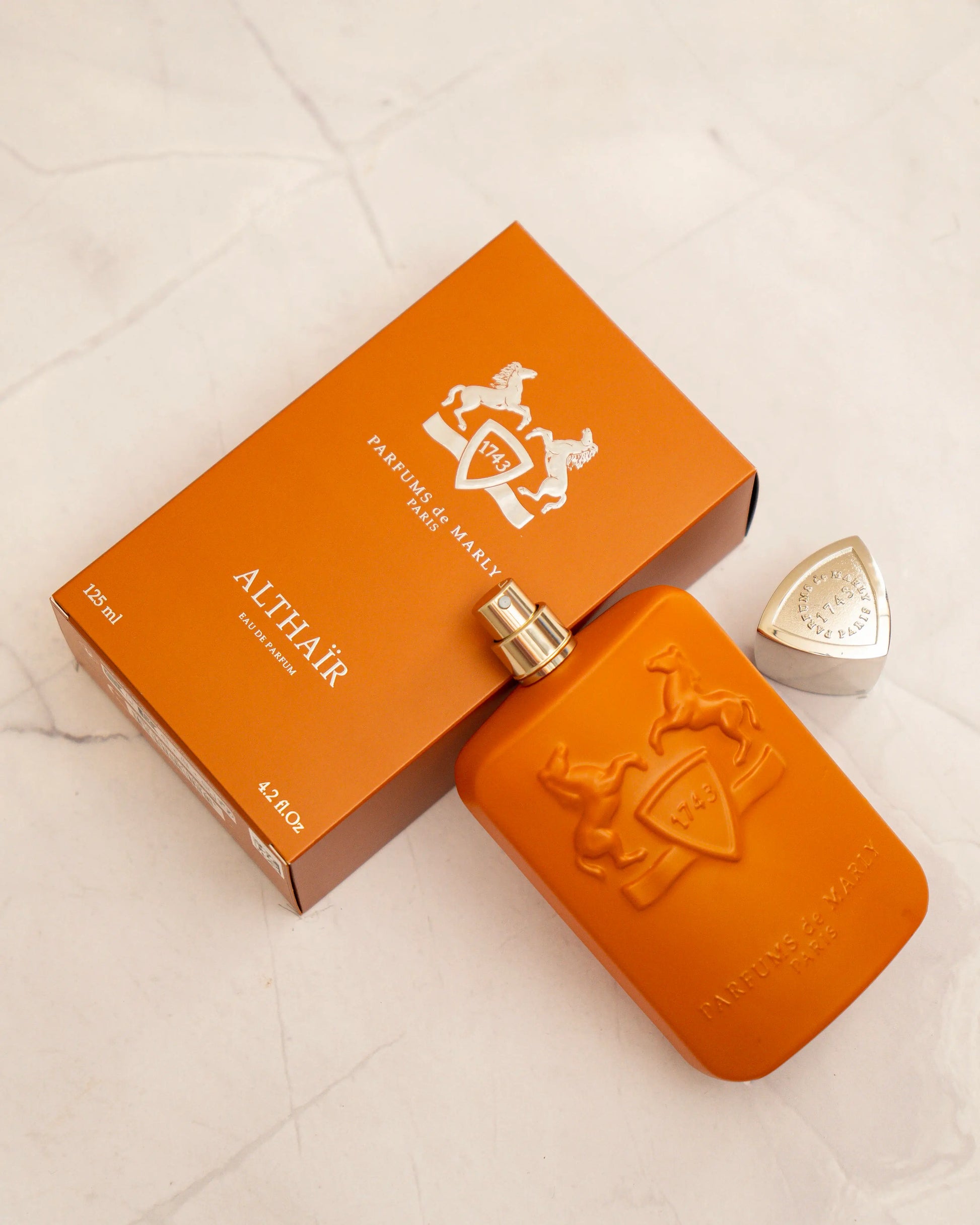Althaïr de Parfums de Marly es una fragancia de la familia olfativa Oriental Vainilla para Hombres. Esta fragancia es nueva. Althaïr se lanzó en 2023. Althaïr fue creada por Hamid Merati-Kashani y Ilias Ermenidis. Las Notas de Salida son canela, cardamomo, flor de azahar del naranjo y bergamota; las Notas de Corazón son vainilla Bourbon y elemí; las Notas de Fondo son praliné, almizcle, ambroxan, madera de gaiac, haba tonka y almendras acarameladas.