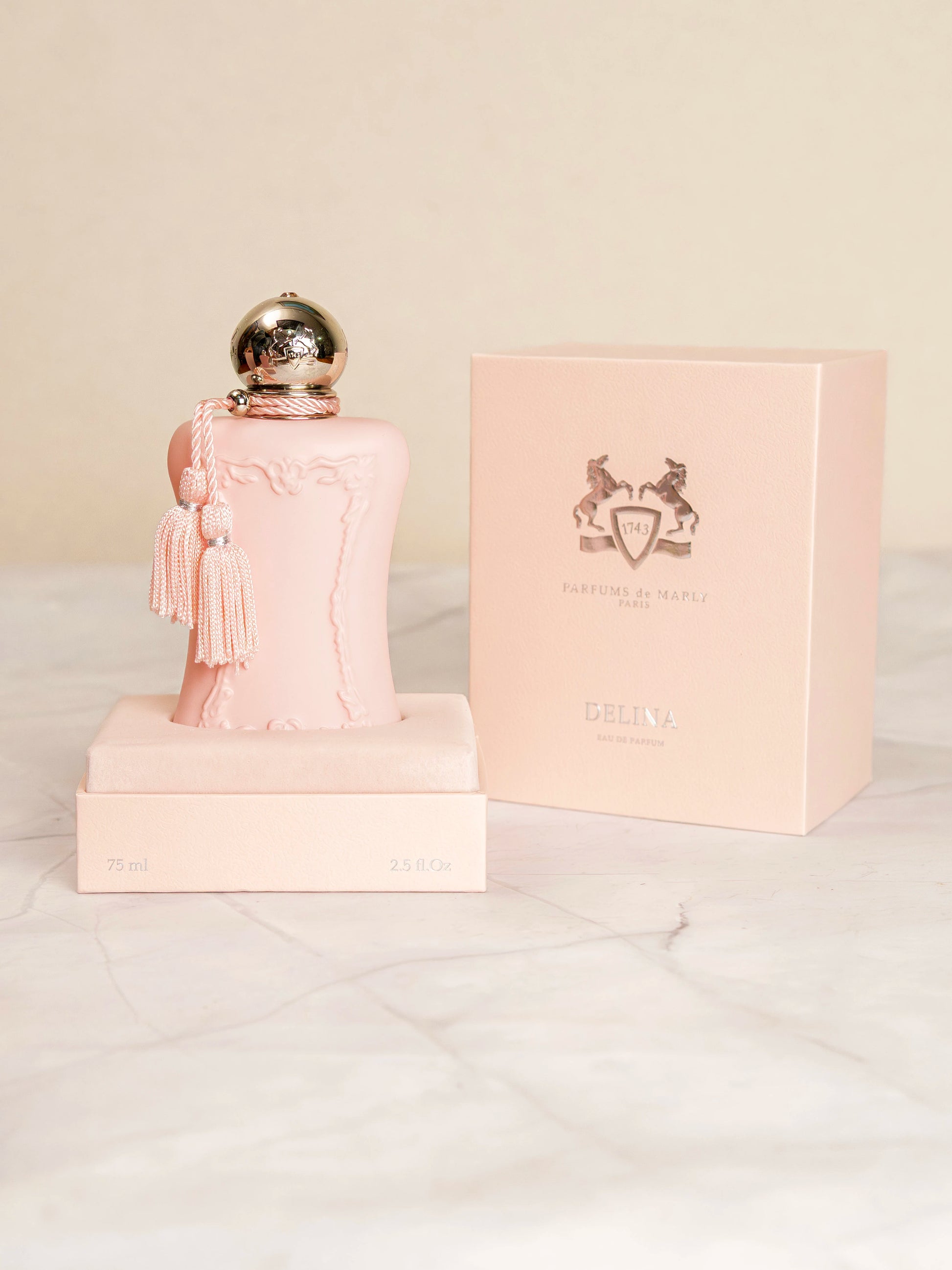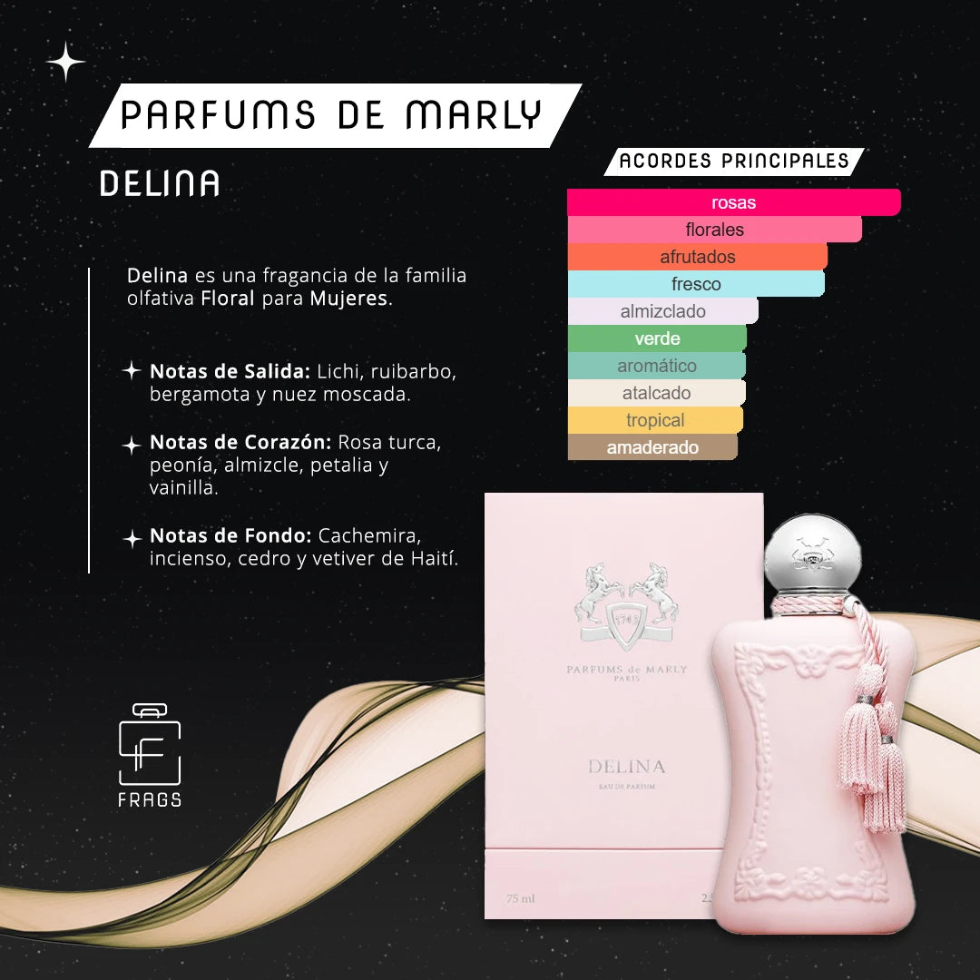 Delina de Parfums de Marly es una fragancia de la familia olfativa Floral para Mujeres. Delina se lanzó en 2017. La Nariz detrás de esta fragancia es Quentin Bisch. Las Notas de Salida son lichi, ruibarbo, bergamota y nuez moscada; las Notas de Corazón son rosa turca, peonía, almizcle, petalia y vainilla; las Notas de Fondo son cachemira, incienso, cedro y vetiver de Haití.