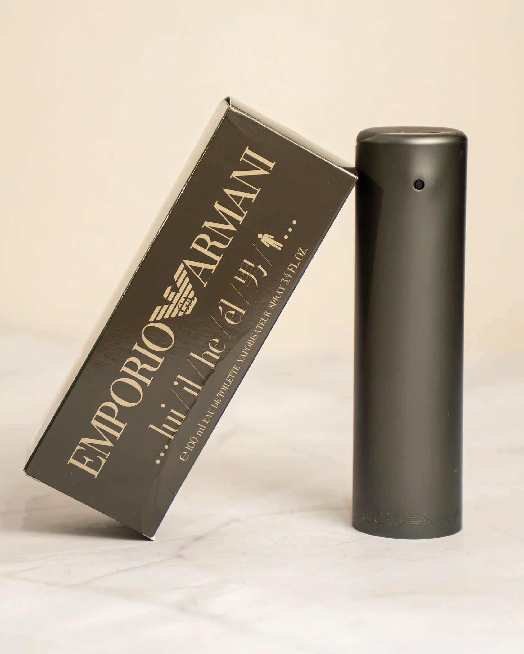 He de Giorgio Armani es una fragancia de la familia olfativa Oriental Amaderada para Hombres. He se lanzó en 2020. He fue creada por Alain Astori y Carlos Benaïm. Las Notas de Salida son yuzu, salvia y cardamomo; las Notas de Corazón son nuez moscada, rosa y raíz de lirio; las Notas de Fondo son almizcle blanco, sándalo, vetiver y haba tonka.
