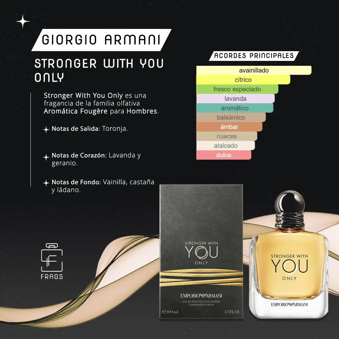 Emporio Armani Stronger With You Only de Giorgio Armani es una fragancia de la familia olfativa Cítrica para Hombres. Esta fragancia es nueva. Emporio Armani Stronger With You Only se lanzó en 2022. La Nota de Salida es toronja; las Notas de Corazón son lavanda y geranio; las Notas de Fondo son vainilla, castaña y ládano.